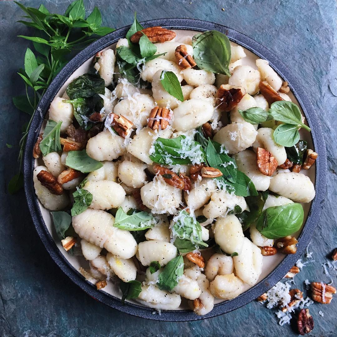 Gnocchi with butter, pecans, and basil! Gnocchi is store bought and the basil is from my container garden. Super easy and quick recipe. I love to play with my food and make it look pretty ?recipe @real_simple July issue #veganized