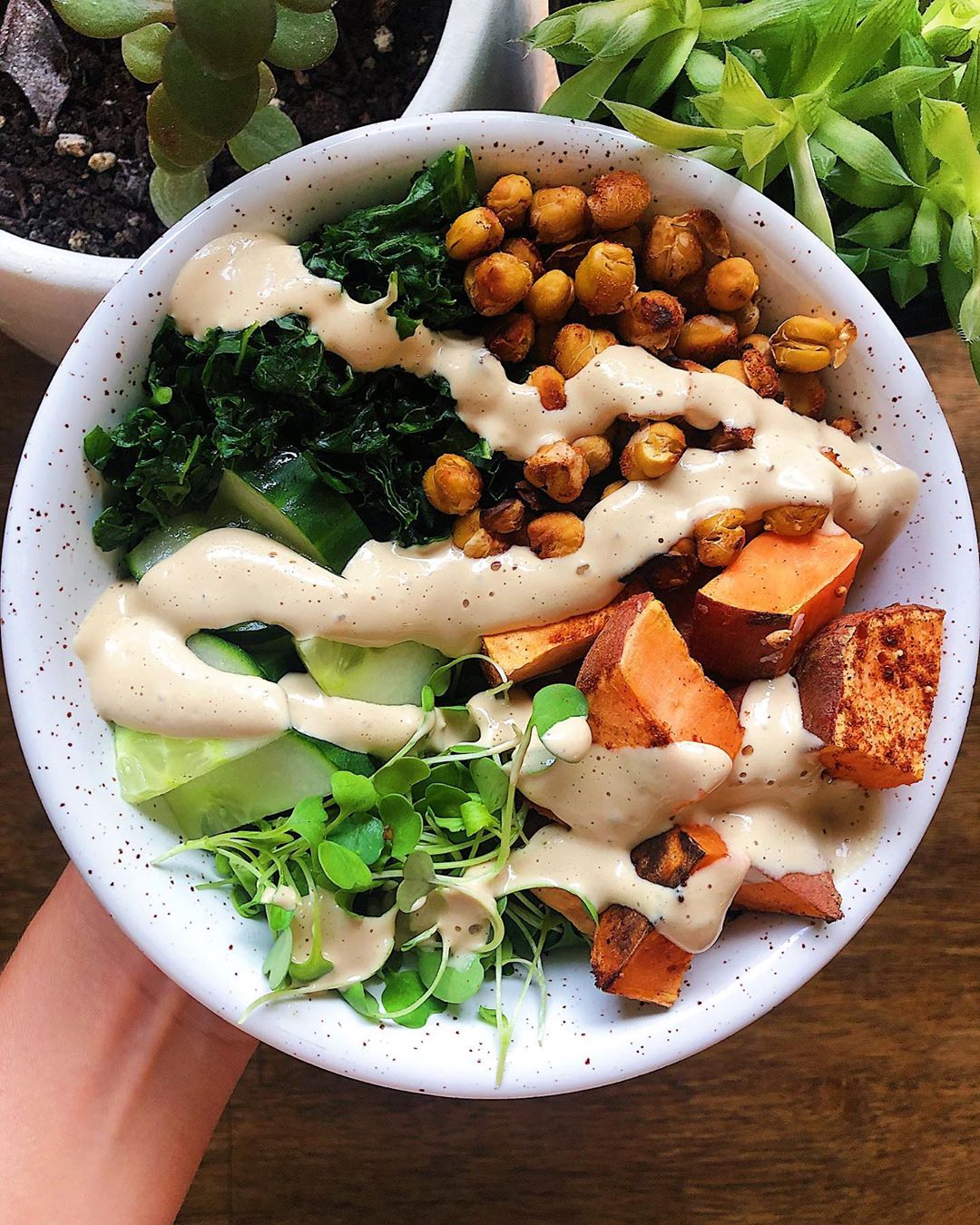 Drain and rinse a can of chickpeas. Chop a large sweet potato. Toss both with garlic powder, smoked paprika + a pinch of salt. Roast at 450 for 25 minutes. Meanwhile, make this savoury sauce from my free easy vegan sauces ebook (link in bio). Once done, add all components together with your choice of veg- I went with massaged kale, celery and micro greens ?