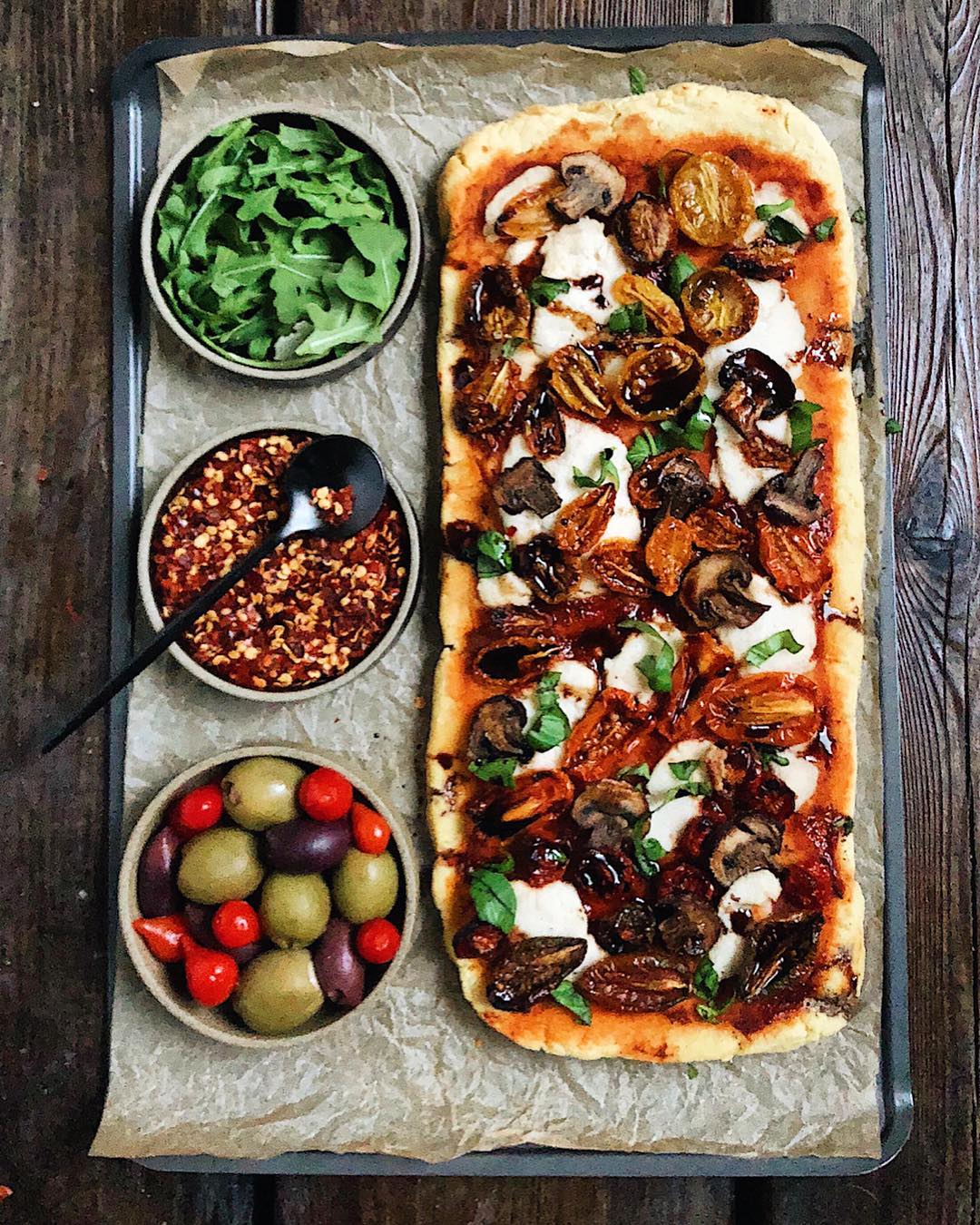 •Pizza inspired by my trip to @screamerspizzeria yesterday ? which you can see in my instastory. ( and no, I don’t keep Passover) Recipe for Passover pizza dough @betweencarpools , which I veganized by using vegan eggs @followyourheart I attached the recipe link for the Passover dough in my instastory, which you can see by swiping up. Happy Wednesday?