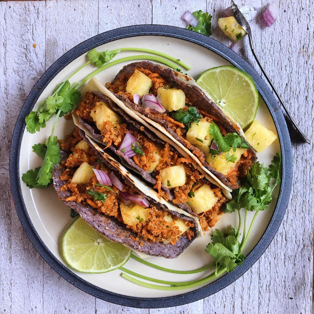 Sweet Potato Al Pastor for Dinner ?The perfect summer taco for #tacotuesday ??? Shredded sweet potatoes, quinoa, mixed with a fresh pineapple chili sauce and topped with a refreshing pineapple salsa. I also doubled up on the tacos shell using both a hard and soft shell held together by refried beans.Plants rule! ✌??? Taco filling and salsa recipe inspired by #thugkitchen #thugkitchen101 cookbook.