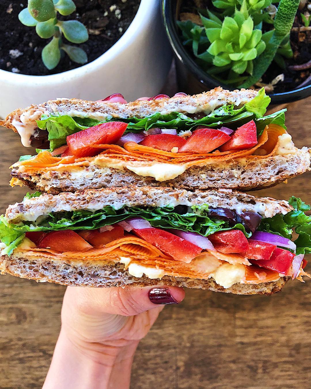 I usually just throw together anything I have in my fridge, but my non-negotiables are some good hummus + kalamata olives ⚡️ This one has hummus, grated carrot, red pepper, kale, red onion, kalamata olives + vegan mayo on @silverhillsbakery bread ?