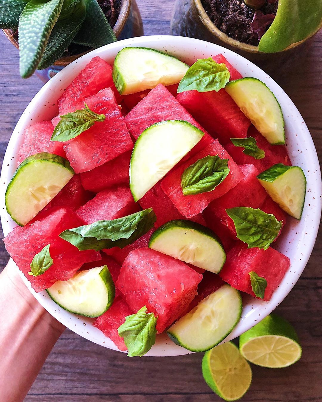 WATERMELON SALAD ?✨ There’s a few foods I can’t get enough of this summer, and watermelon is definitely one of them (the other is peaches)- The perfect refreshing snack on a hot day ☀️ Watermelon is a great source of potassium, vitamin C, vitamin A and is so hydrating in these summer months ? I paired it with cucumber slices, basil and a generous squeeze of lime here for the perfect lil’ summer side salad ✨.